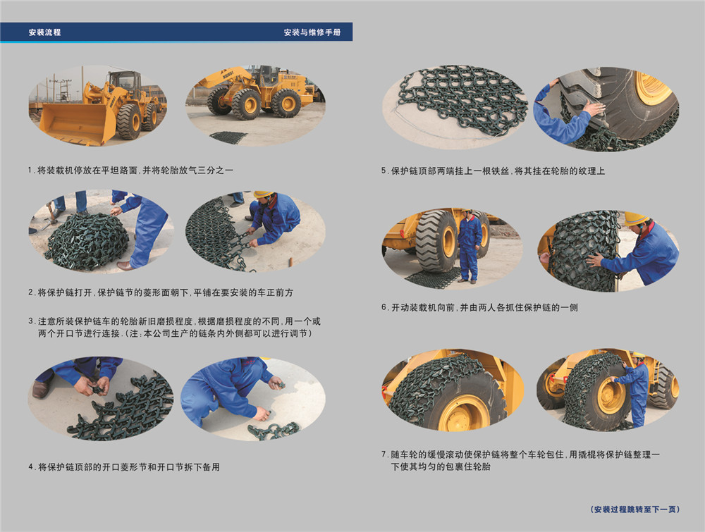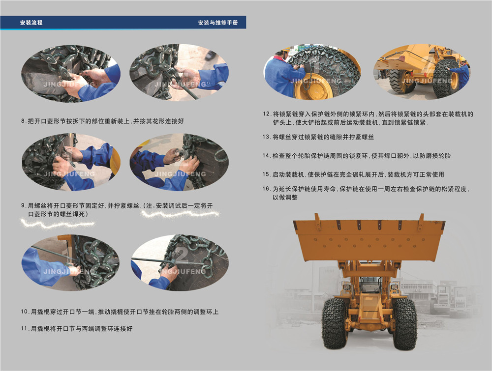 8.檢查整個輪胎保護鏈的鎖緊環(huán),使其焊口朝外,以免磨損輪胎。
